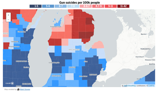 Minneapolis has rates of both that equate to central and western Washington, and also has similar demographics. But once you get off into the rural areas to the north and east such as Michigan the gun suicide rates jump significantly and the gun homicide rates crater to zero. It’s obviously not “the guns” there either. The difference in Michigan is tremendous, look at this: