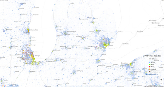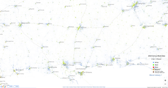 The second image here is from the Racial Dot Map, from the Cooper Center at the University of Virginia. It is also interactive, and allows you to zoom around. Green dots in the second map are black folks. This is relatively self explanatory, and fits with the overall demographic rates expressed in the bar chart above. Gun homicide in the United States is largely a poor black problem. Characterizing it as an urban problem would not be correct, however, and you can see why in Mississippi: