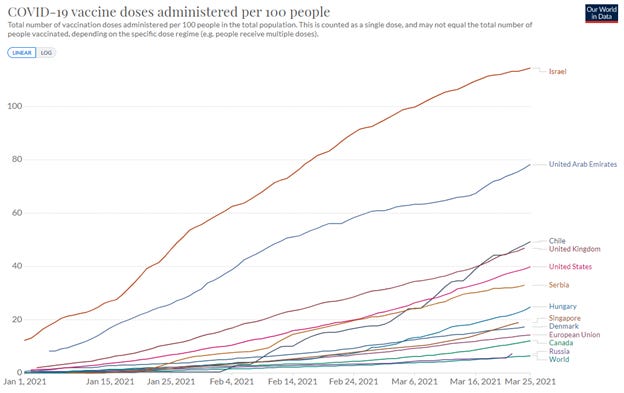 Some version of this drama played out in all the countries leading the world in vaccinations, even the developing countries. Chile has no appreciable local vaccine production, but it does act as a kind of east-west economic crossroads, and it cut early deals with AstraZeneca, Johnson & Johnson, Sinovac, and CanSino for vaccine delivery priority in return for letting all four companies run trials there. Their current leadership is notoriously capitalistic, so much so that they dealt with a terrific populist uprising in 2019, but the folks in the driver’s seat there knew how to wheel and deal “me-first.” I speak with people in Chile, and they’ve had a rough go of it the past few years. I will not claim to support or oppose their current leadership, but it is clear that their leadership’s mindset is getting them vaccines.