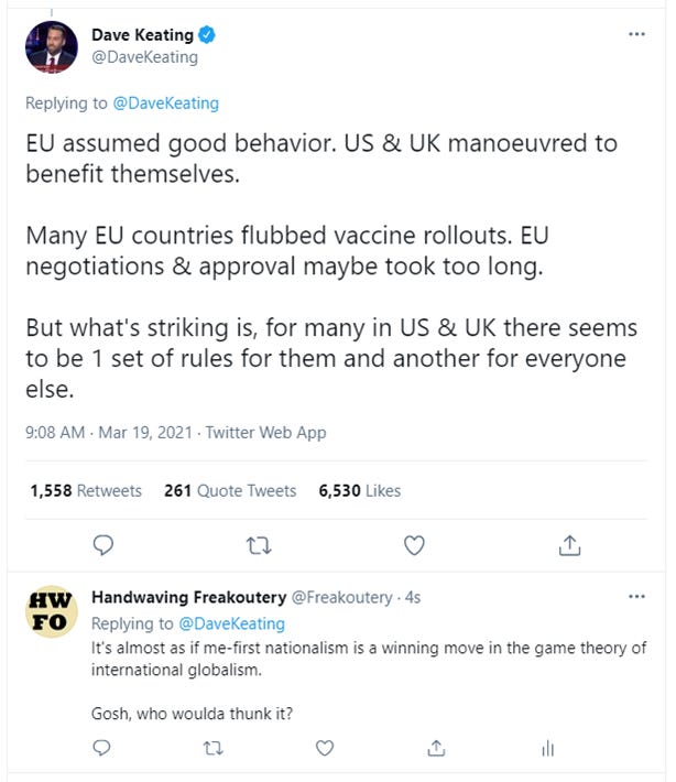 The deeper question is this. In the game of nations, do you actually want things to be fair, or do you want your vaccine first? It’s an important question to ask.
