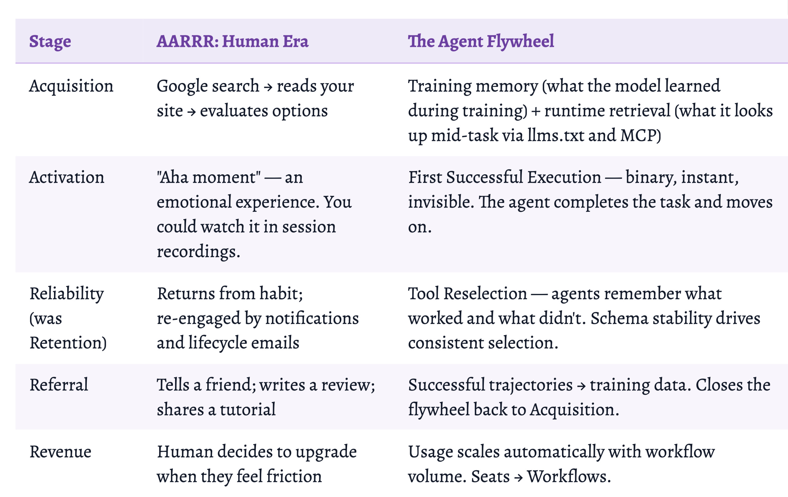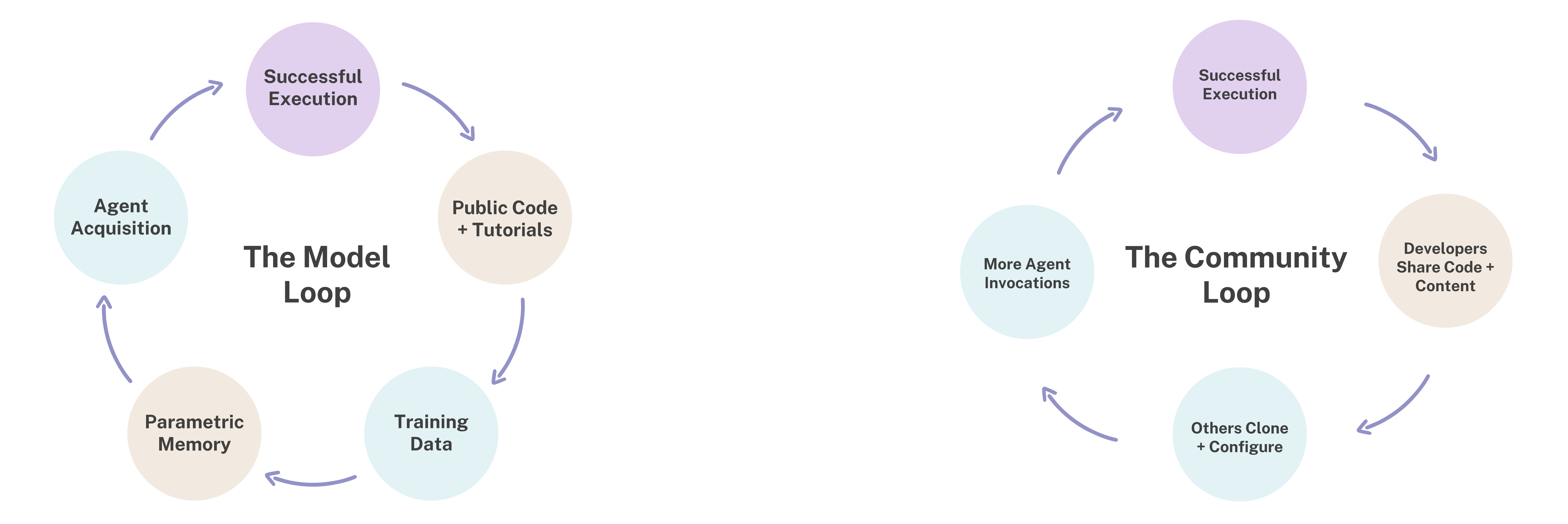 The agent flywheel compounds faster and more durably. When agents successfully complete tasks using your product, those trajectories can become training data for the next model generation. More completions → stronger model memory → higher default selection → more completions. And the community loop runs in parallel: developers who succeed with your product publish their configs, other developers clone them, propagating your tool across thousands of agent deployments at once.