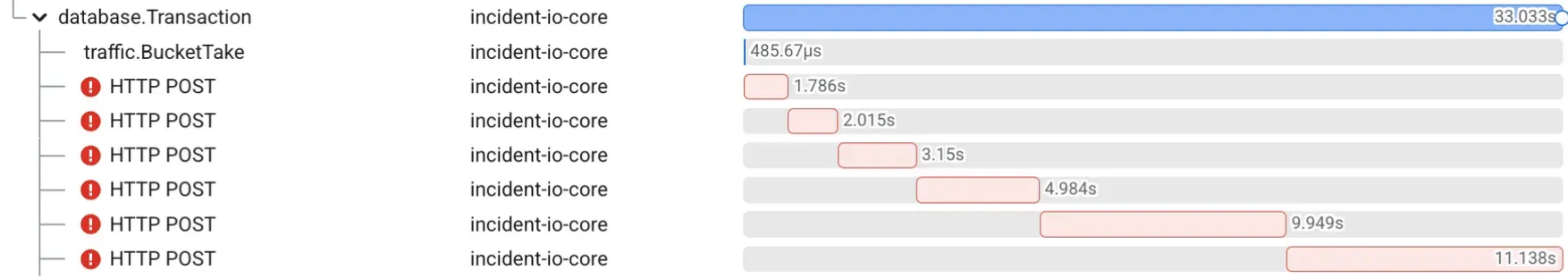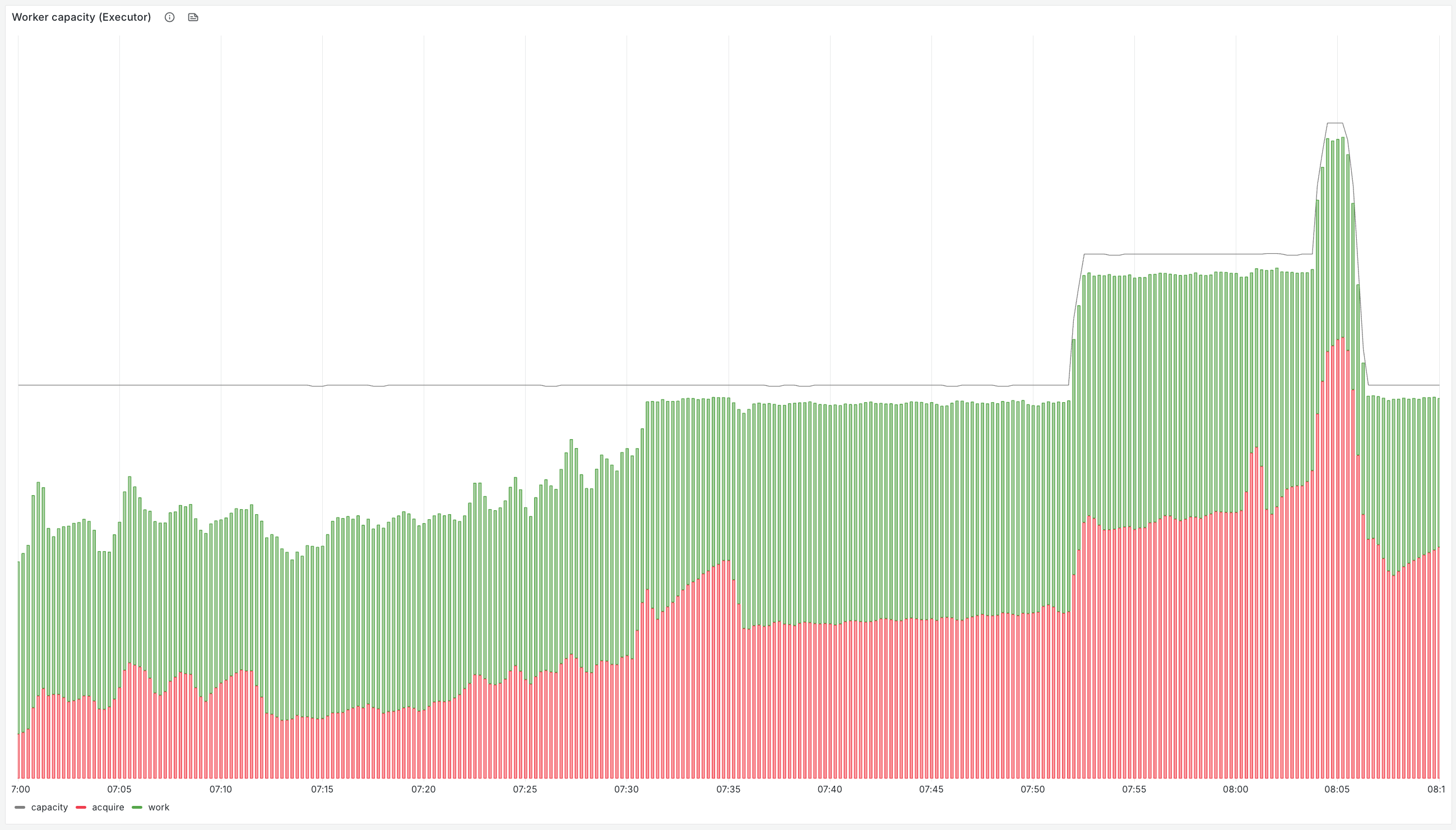 The red shows the time spent by our workers acquiring escalations from our queue, where acquisition had began to represent a substantial amount of the total worker capacity. This acquisition is intended to be essentially ‘free’, and should be showing as no more than ~3% of this chart. During the incident it had crept-up to almost ~50% of available worker capacity.