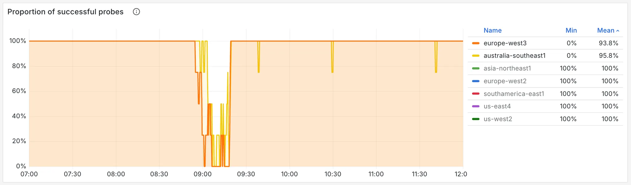 We also constantly run blackbox exporters on 9 regions across the globe to monitor availability and latency metrics. Through these, we confirmed errors affecting probes from europe-west3 and australia-southeast1 during the above 25 minute period. Provider metrics confirmed this and also that all other regions were unaffected.