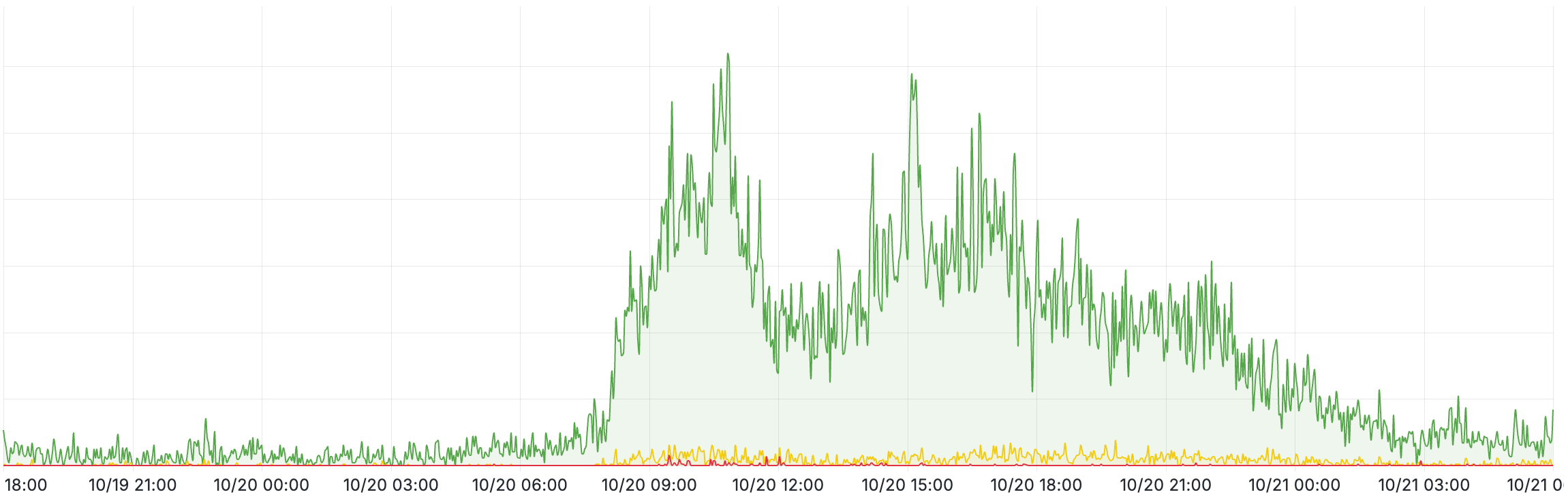 In the 24 hours after AWS first saw issues, 14,000 people collectively spent 12,500 hours (1.5 years!) actively responding to incidents with incident.io. We saw a 4x traffic increase to status pages as everyone fought hard to keep customers informed, peaking at around 4.5 million requests per hour and a significant increase in monitoring alerts, as systems went offline around the world.