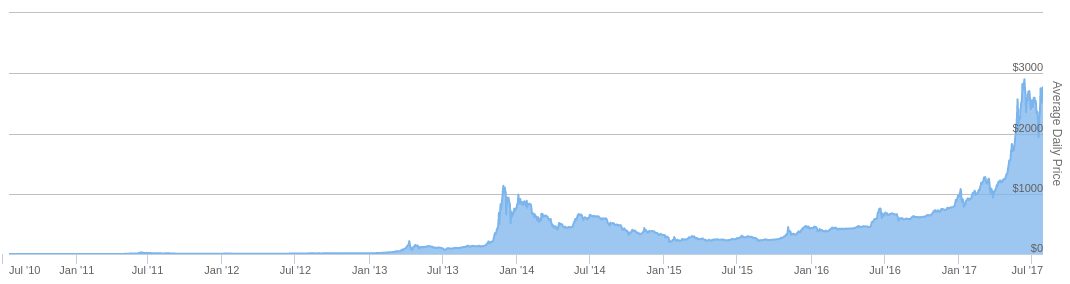 In June 2017, there was a negligible (~4%) increase in Bitcoin price ($2400 to $2500), and during July 2017 the price increased from $2500 to $2700 (~8%).