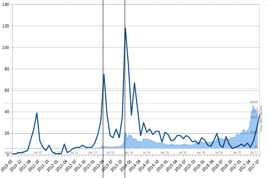 In July 2017, there was once again a jump up to ~40 Bitcoin-related posts. What will next month see?