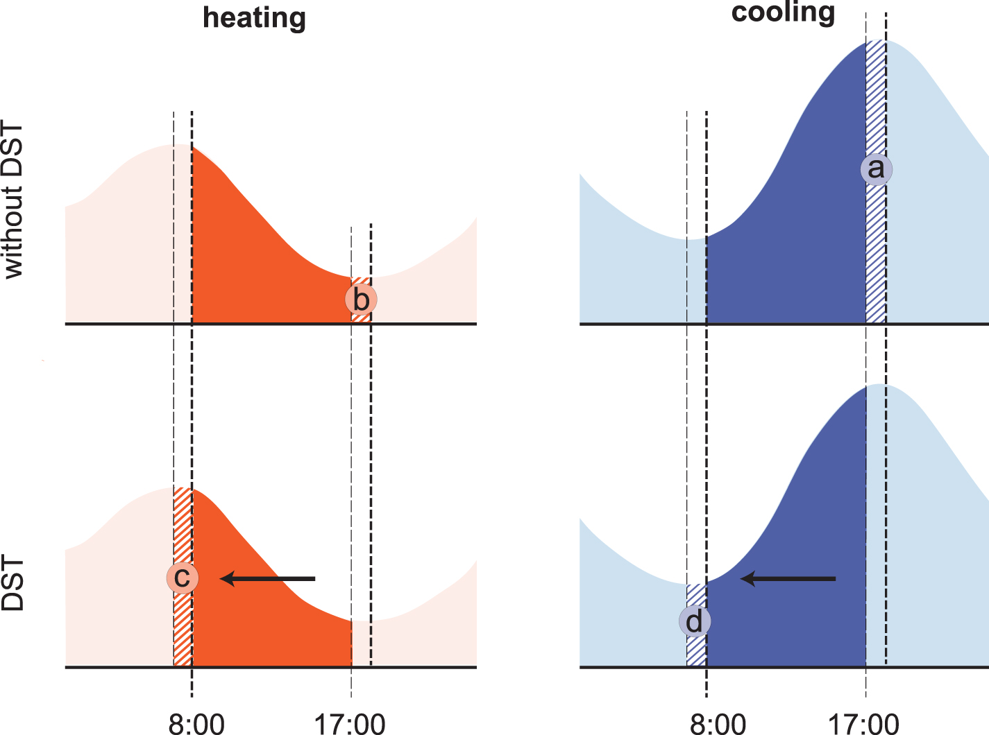 Figure 1. Conceptual representation showing the shift in working hours ahead by one hour with introducing daylight saving time (DST), compared to standard time (without DST) for a typical heating and cooling energy demand profile. Visualized idealized heating and cooling demand of a building, showing both working hour patterns. The portions of cooling or heating demand only required in one of the two modes (DST or without DST) are indicated with the areas labelled ‘a–d’.