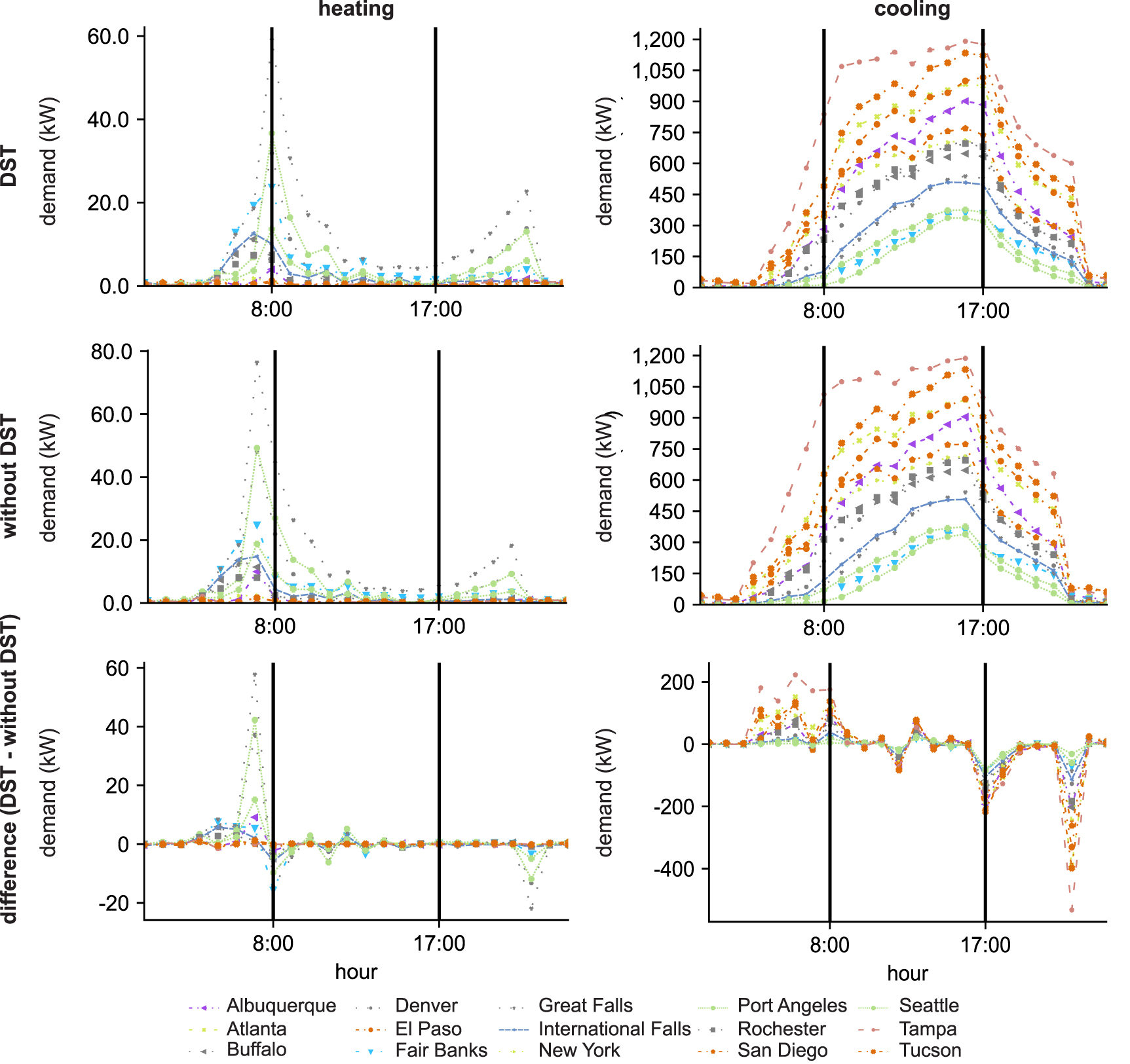 Figure 3. Hourly simulated cooling and heating demand for large offices. Averaged cooling and heating demand of all days in the DST time period of the year 2020 for each case study with and without DST. These profiles confirm the general pattern of peak cooling demand in the afternoon and peak heating demand in the morning and the expected effect when DST is introduced.