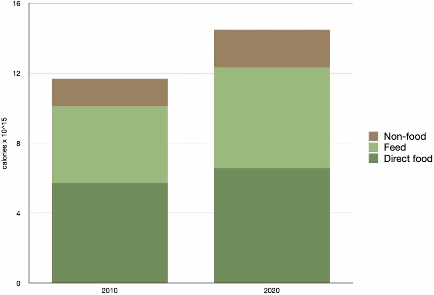 Figure 1. Crop production utilized as food, feed, and non-food uses. Total calorie production on croplands increased 23.9% between 2010 and 2020. This increase was primarily due to calories used for feed and non-food purposes. For context, 1 × 1015 calories are enough to meet the annual caloric needs of 1 billion people eating 2700 kilocalories per day.