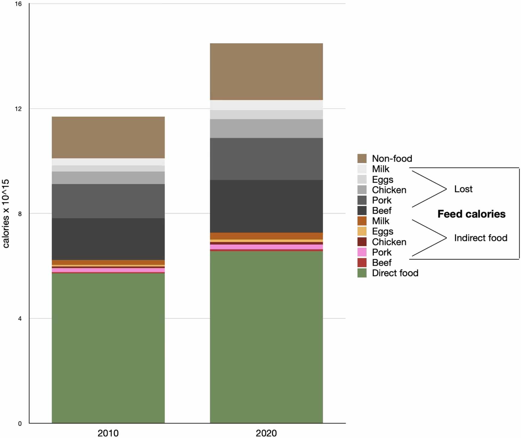 Calorie production on global croplands increased by 23.9% from 2010 to 2020 while cropland area only increased by 3.2% [1]. However, croplands were less efficient at delivering available calories to the food system in 2020 than in 2010. This decreased efficiency is primarily due to a greater fraction of calories allocated to feed and non-food uses. Feed and non-food calories increased by 31.2% and 36.3%, respectively, while calories consumed directly as food only increased by 14.9%. While consumption of meat, dairy, and eggs increased globally, beef consumption was the largest driver of increased feed use. From 2010 to 2020, feed calories used for beef production increased by 25.8%.