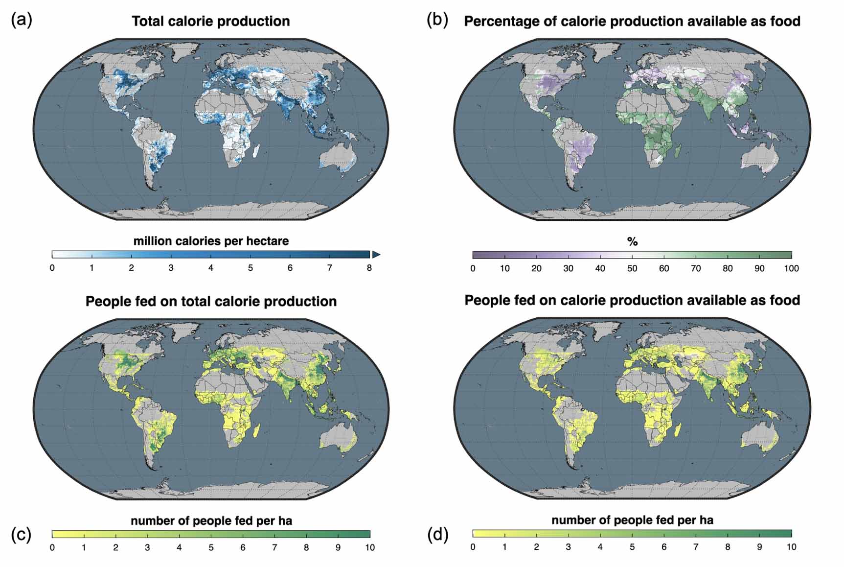 Figure 3. Geographic patterns of calories produced and available for as food for 50 crops in 2020. The above maps show (a) total calorie production, (b) of the percentage total calories available as food after accounting for feed-to-food efficiency, (c) the number of people potential fed per hectare based on total calorie production and (d) the number of people potentially fed per hectare of available calories. Available calories are the sum of direct and indirect (livestock commodities via feed) calories. The number of people fed per hectare assumes an annual intake of 2700 kcal/day. Maps for the years 2010 and 2015 are in figures S1–S4 in the supplemental material. Estimates of the number of people fed per hectare at 2300 kcal/day, 2500 kcal/day, and 2700 kcal/day are provided in tables S6(a)–(c).