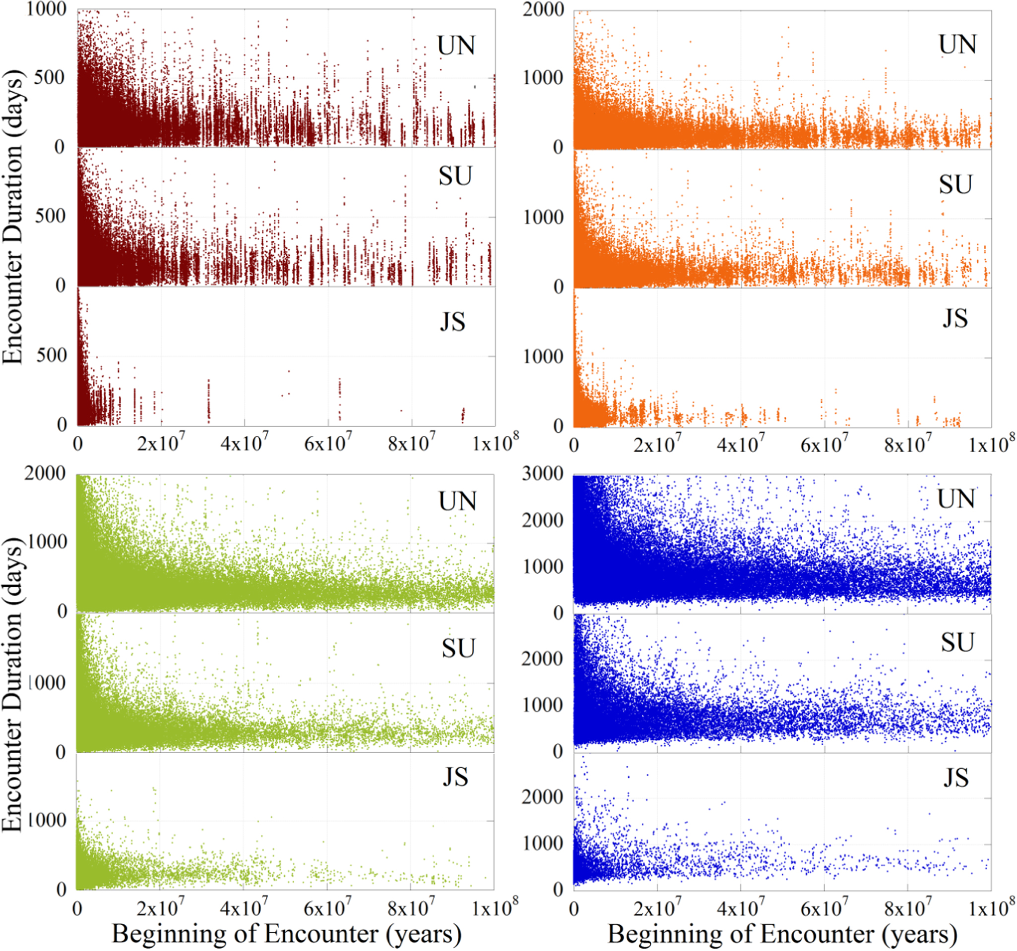 Such scenarios are evident in the lower two panels of Figure 2, which display the time encounters occurred within the simulations versus their durations. The vertical structure seen in the plot for Jupiter in the upper left represents such rapid successions of encounters—with varying durations reflecting successively deeper or shallower passes through Jupiter’s sphere of influence—or even TSC orbits. It is possible that, in some cases, it takes more than one pass to convert a Centaur into a JFC, and this might also be part of these series of encounters (a scenario we do not explore here, but worthy of further study). The same succession of close approaches is apparent for Saturn and the Saturn Family Comets (SFCs) in the upper right of Figure 1.
