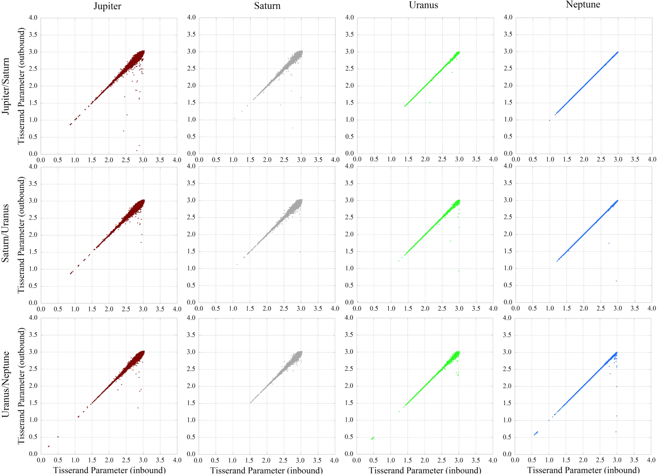 A core tenet of studies that use the Tisserand parameter as a means to distinguish between objects that should exhibit markedly different behaviors and/or histories is the idea that the Tisserand parameter with respect to a given planet will be conserved through the course of a single close encounter with that planet. At the same time, that encounter would be expected to modify the orbit of the small body in question, which would naturally alter the value of the Tisserand parameter of that object’s orbit with each of the other giant planets. In other words, through the course of an encounter with Jupiter, the value of TJ would not change, but the values for the other Jovian planets—TS, TU, and TN—could be dramatically changed.