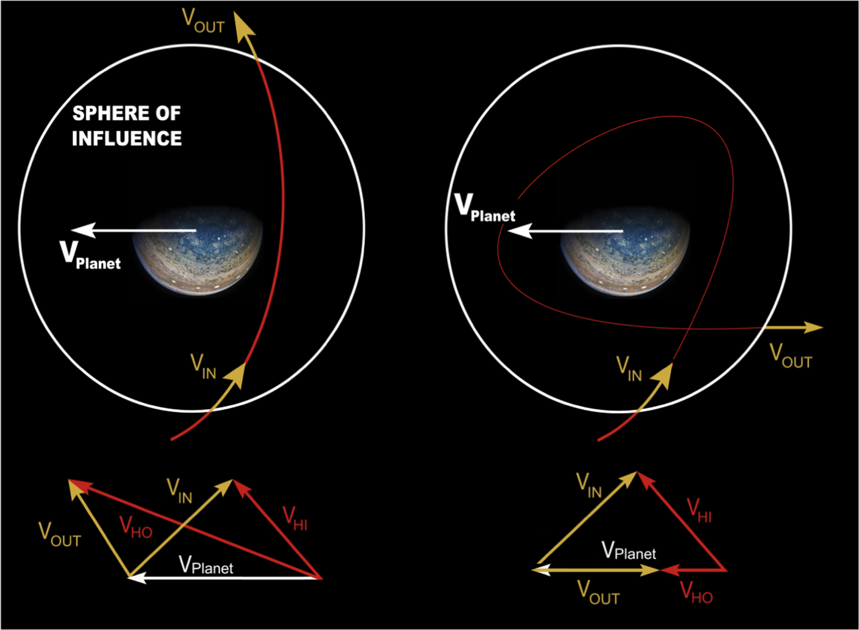 Figure 6. Two depictions of the ways in which close approaches alter planetesimal trajectories. Most encounters are of the geometry shown on the left-hand side: a single hyperbolic pass. The vector diagram beneath shows that although the magnitudes of the inbound (vin) and outbound (vout) planet/planetesimal relative velocity vectors are equal, when translated into the heliocentric frame by adding the velocity of the planet (yielding vHI and vHO), the velocity vector changes direction and increases in magnitude. This is a gravity-assist geometry—also the geometry by which JFCs are converted into Centaurs. Depicted on the right-hand side is an idealized illustration of the process by which a Centaur is converted into a JFC. In the vector diagram describing the encounter, the particle would be moving parallel to Jupiter upon exit from the close approach but much slower in the heliocentric frame, making the point where the particle leaves Jupiter’s sphere of influence the particle’s new aphelion.