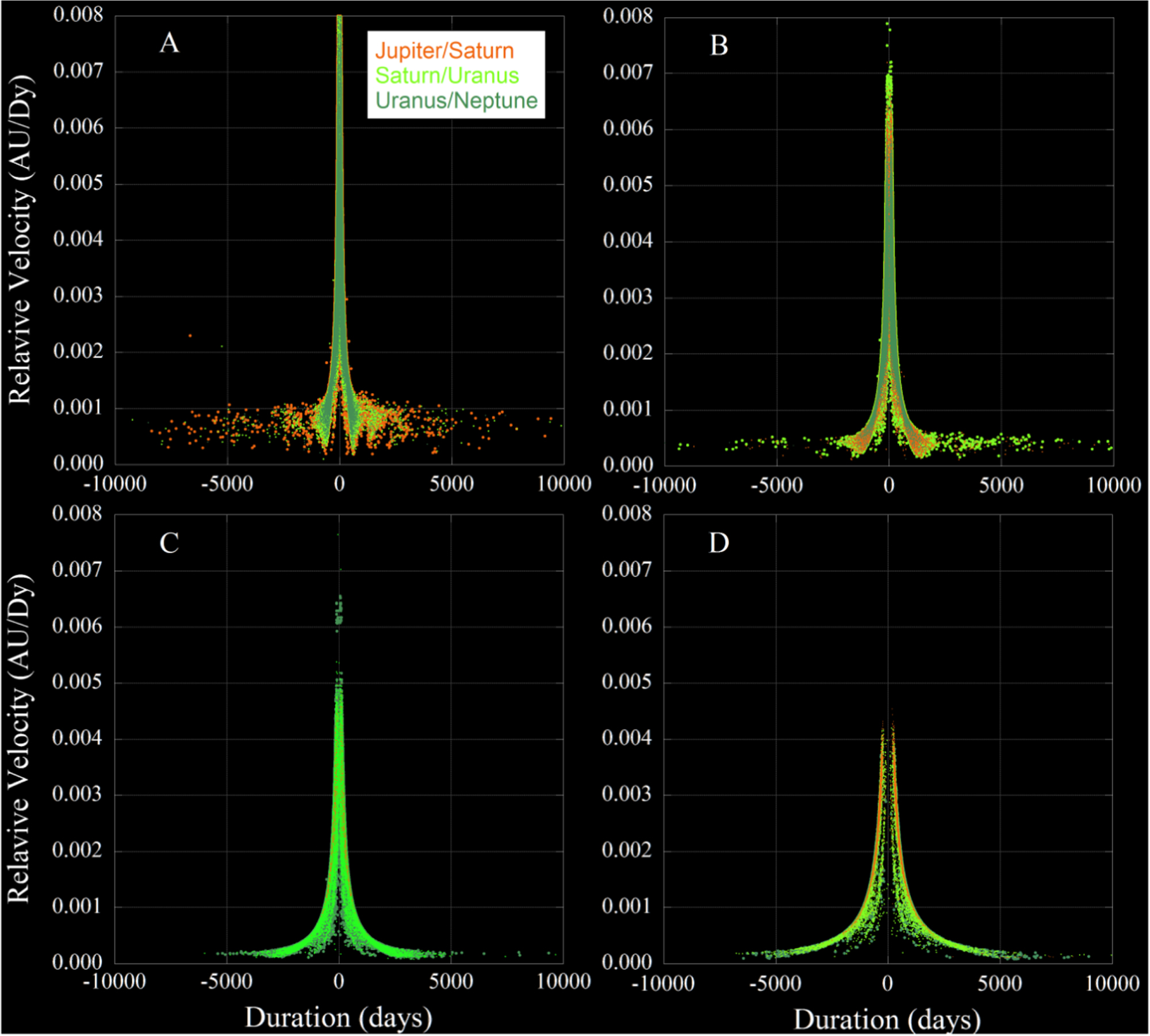 Figure 7. Encounter duration in days vs. planetesimal/planet relative velocity at the ingress of a close approach to Jupiter (A), Saturn (B), Uranus (C), and Neptune (D). Each plot represents encounters with a planet for particles from all three sets of simulations: JS, SU, and UN. Negative duration values represent retrograde encounters.