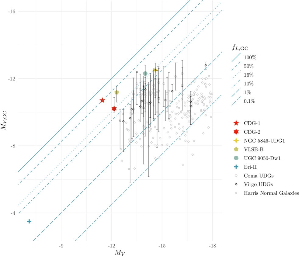 Figure 4 shows the GCLF-corrected fL,GC and fM,GC of CDG-2 as a function of dCDG-2. Under the canonical GCLF assumption, the result here shows that the GCLF-corrected light and mass ratios are respectively well above 23% and 18% even if CDG-2 is 20 Mpc closer than previously assumed (dCDG-2 = 55 Mpc).