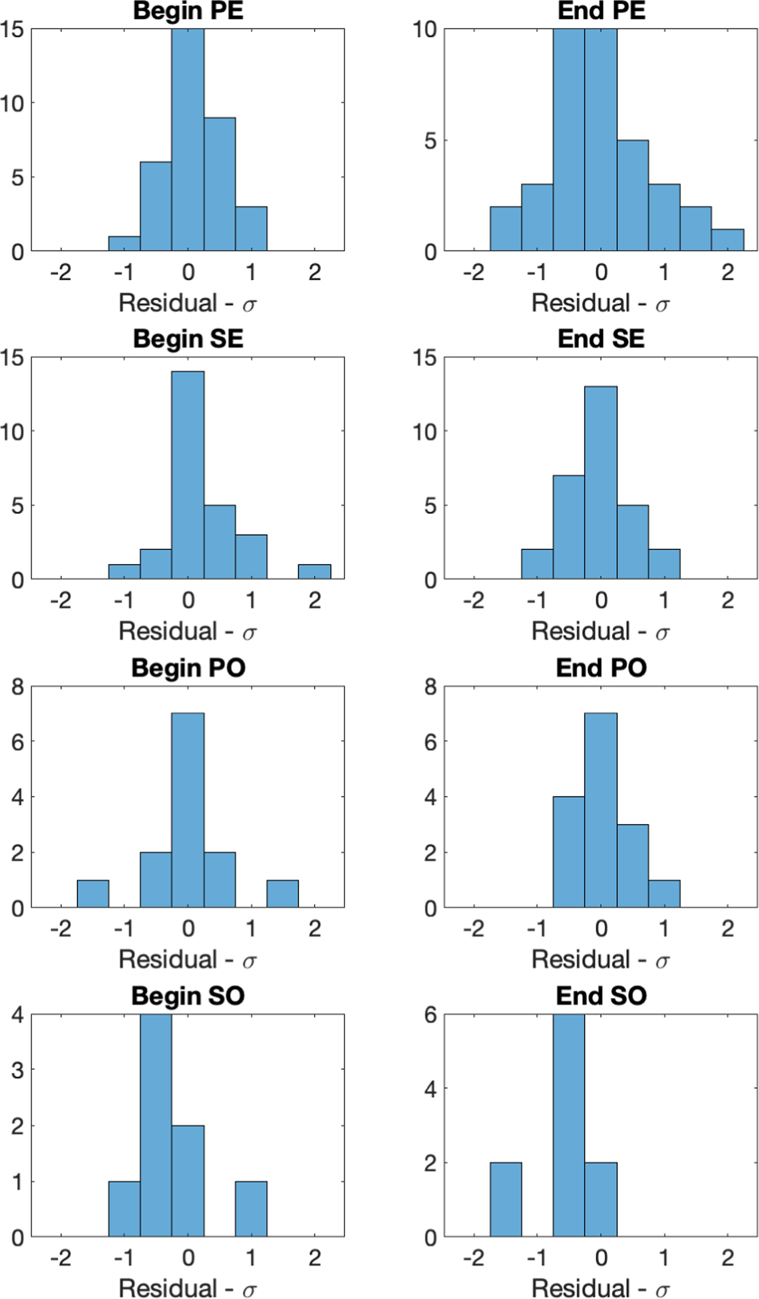 Figure 6. Histogram of the residuals for each type of event time. PE and PO stand for primary eclipse and primary occultation. SE and SO stand for secondary eclipse and secondary occultation.