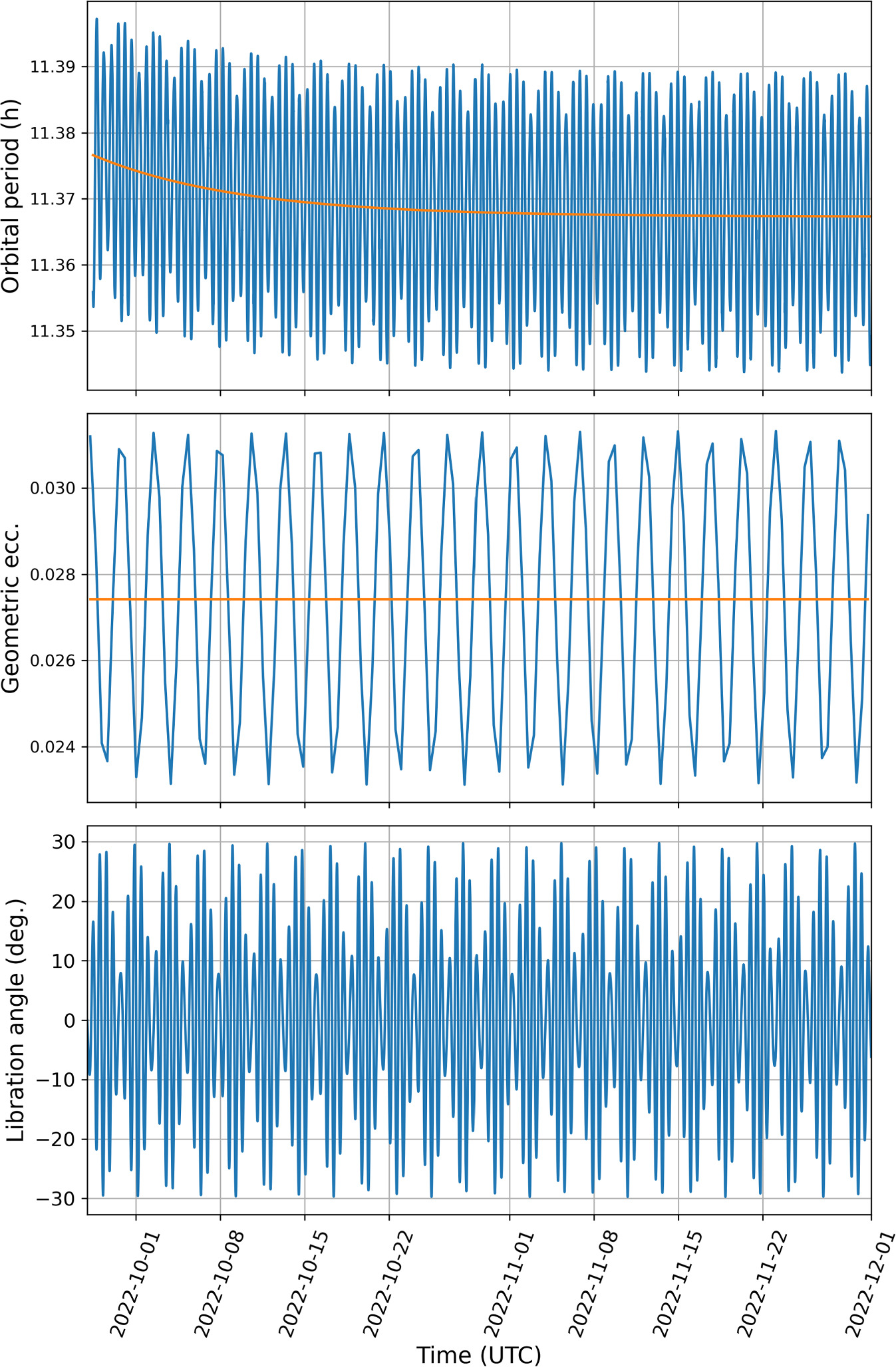 Figure 8. Postimpact orbital period (top), geometric eccentricity (middle), and libration angle (bottom) derived from the best-fit orbit of Dimorphos as a function of time, beginning at the time of the DART impact. We measure orbital period as the time between consecutive crossings of an inertial reference direction in the orbit plane. Orange curves show the best-fit exponential curve to the orbital period and the mean geometric eccentricity.