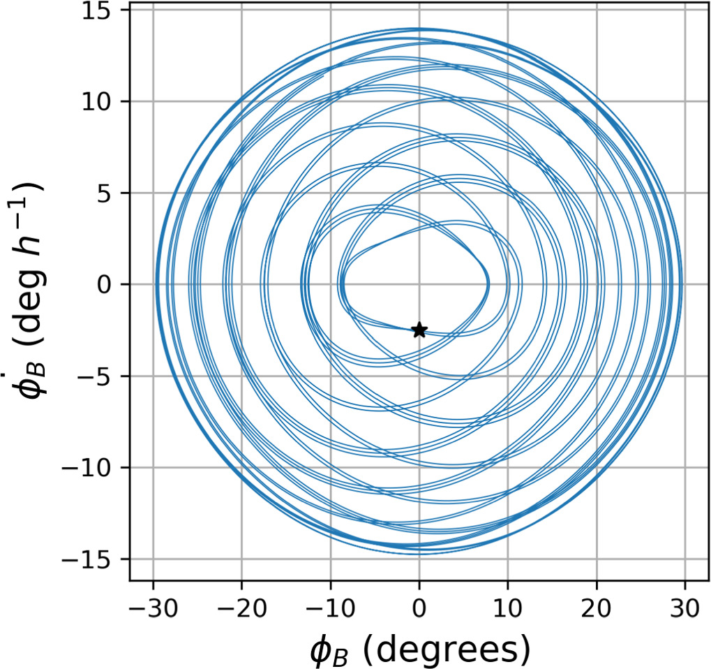 Figure 9. Postimpact libration angle vs. libration velocity of the best-fit orbit of Dimorphos. The star shows the state at impact, which corresponds to ϕB = −1.2 × 10−5 rad s−1 listed in Table 1. The libration amplitude is about 30°.