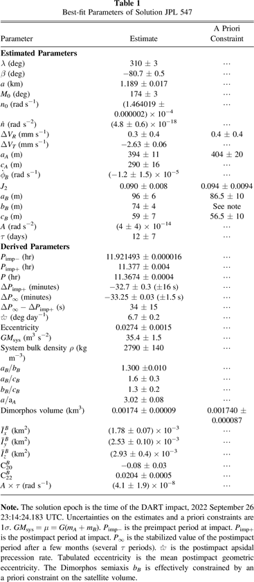 We have no rigorous means of estimating the impact of any mismodeling on the errors in our estimates or their associated uncertainties, but a factor of 1.5× could be a reasonable scale factor on some of our uncertainties. However, the quality of our fits is good enough that we see no need to invoke, for example, a dramatically more complicated dynamics than we have presented here. In the course of this effort, we have made many solutions, and we find that some of the estimates hold up remarkably well to dynamical model variations and differing observational treatments. In particular, the various estimates of the orbital period and changes to the orbital period appear robust. Also, the shape of Dimorphos, and in particular the ratio aB /bB , which has a relative uncertainty of better than 1%, has consistently fallen close to a value of 1.3.