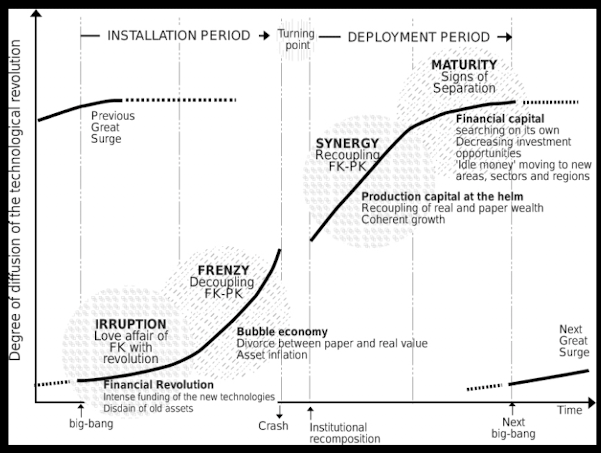 The economist Carlota Perez spent decades studying these patterns. She noticed something that most observers missed. These booms and busts weren't random. They followed a predictable structure tied to what economists call general-purpose technologies: fundamental innovations like steam power, electricity, or the internet that transform entire economies.