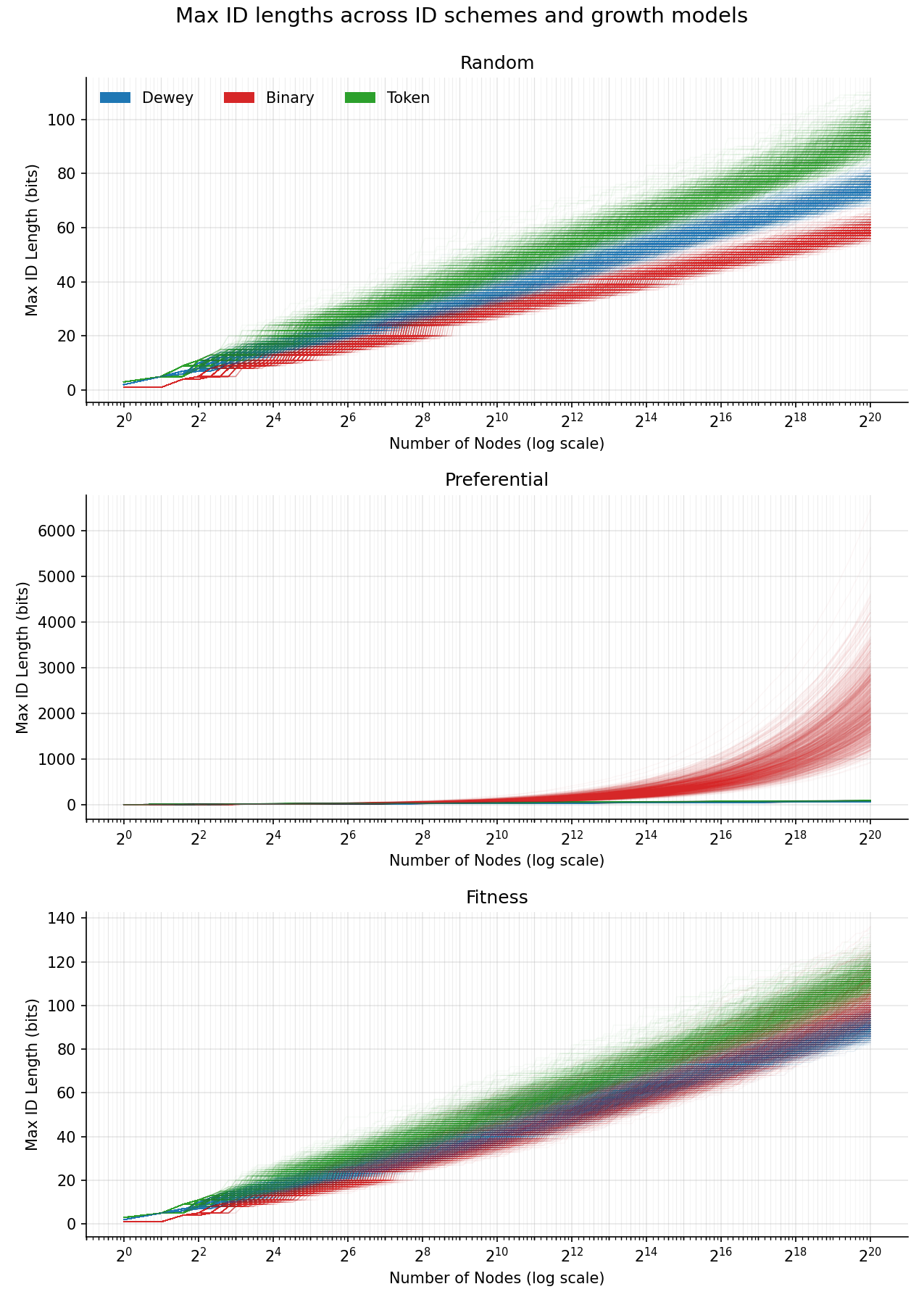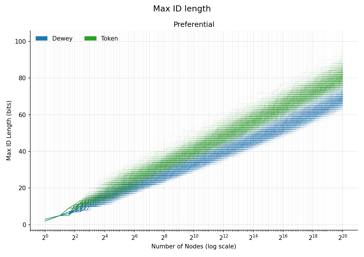 For example, we can look at a preferential attachment random graph, where nodes are more likely to connect to nodes with more connections, a model which many real-world networks follow. The width of the tree will dominate the depth, so we might expect Dewey to win out. Specifically, preferential attachment chooses a node weighted by the degree (number of edges) to choose a parent, which increases the degree of that parent, creating positive feedback. Let’s see how each ID assignment scheme handles this new growth model.