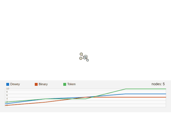 The best scheme is Binary, followed by Dewey, and Token is the worst. This makes some sense since a random tree will grow at a roughly equal rates in depth and width, which is the best-case for Binary. Dewey and Token are harder to reason about, but we suspect that Dewey does best for high-width trees and Token for high-depth trees.