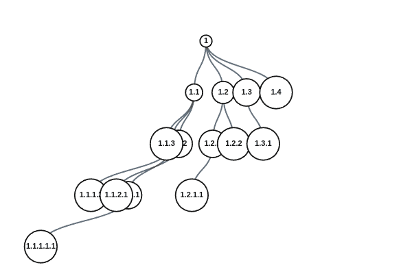 We see one worst-case tree is the chain. This best-case tree for Dewey seems to have every node double its children, then repeat. This causes it to grow wide quite quickly. This indicates that this scheme would be great if we expect new devices to primarily request IDs from nodes that already have many children, but not great if we expect new devices to request IDs from other newer devices (the chain is the extreme example of this).