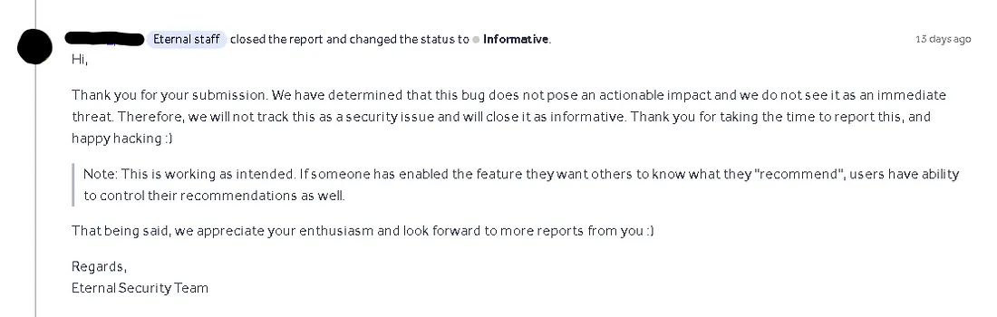 Last week, I reported a privacy flaw in Zomato’s “Friend Recommendations” feature with a proof-of-concept video and an automated script. Eternal (Zomato’s parent company after the rebrand) closed the ticket in 12 minutes, labelling the ability to track a stranger’s approximate physical location as “Intended Behaviour.”