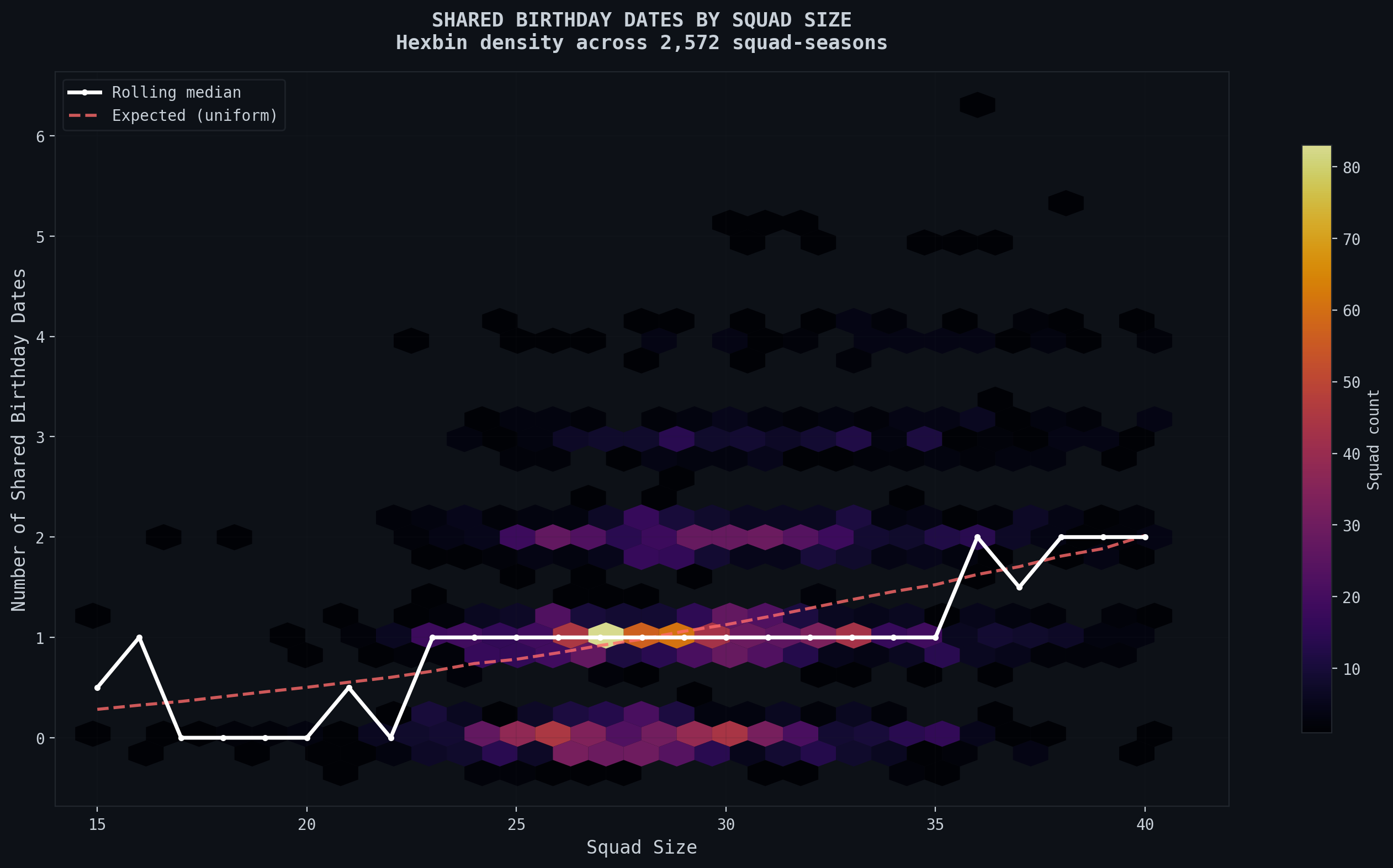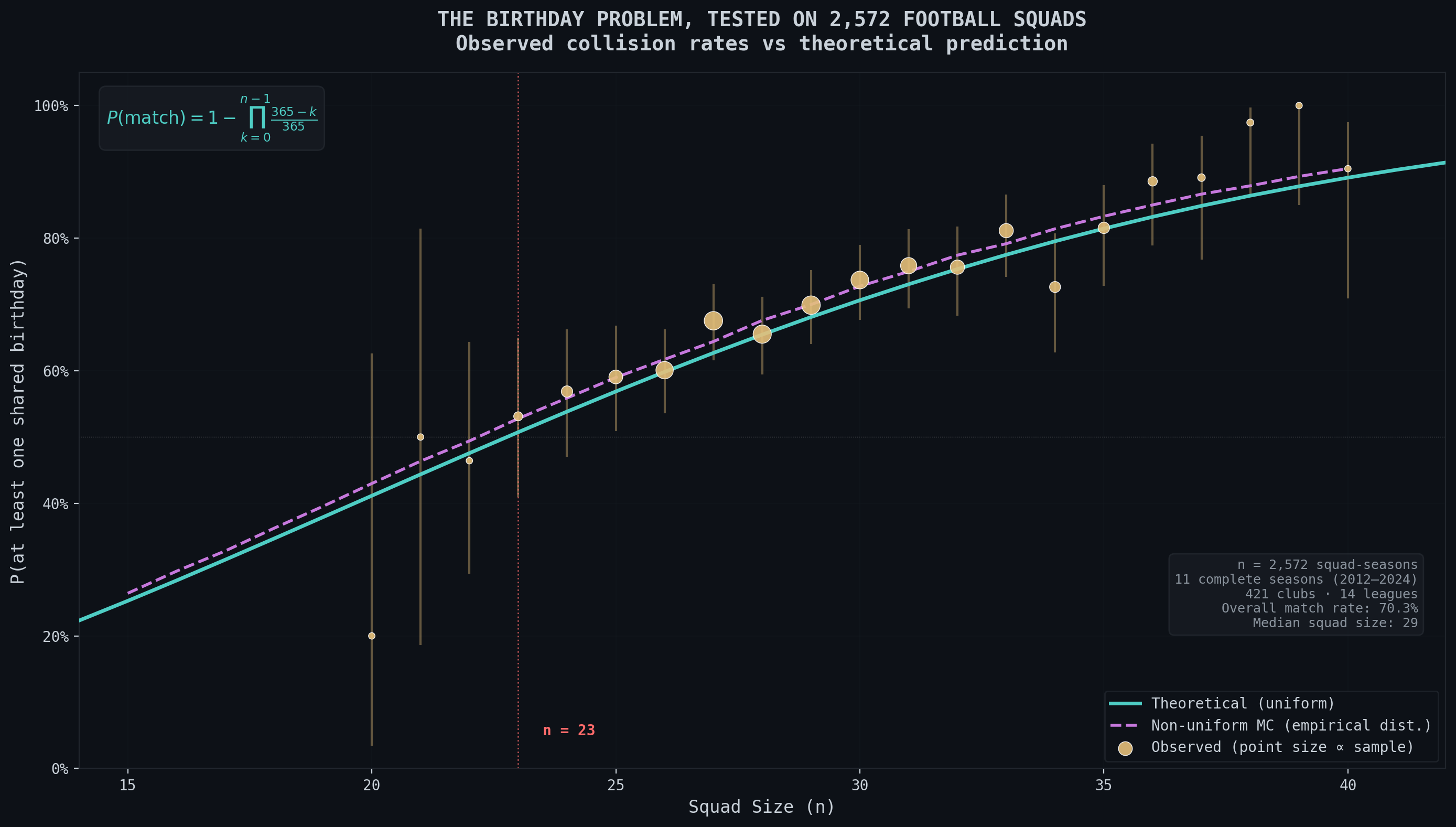 The cyan line is the probability of a match in birthdays if the distribution of footballer birthdays was uniform. The dotted line is the expected probabilities for the specific distribution that the footballer birthdays create. The outliers at 20 and beyond 35 are due to less than 20 squads at those sizes and just not enough data. The following figure also helps demonstrate how a majority of teams are around that 25 to 28 player mark:
