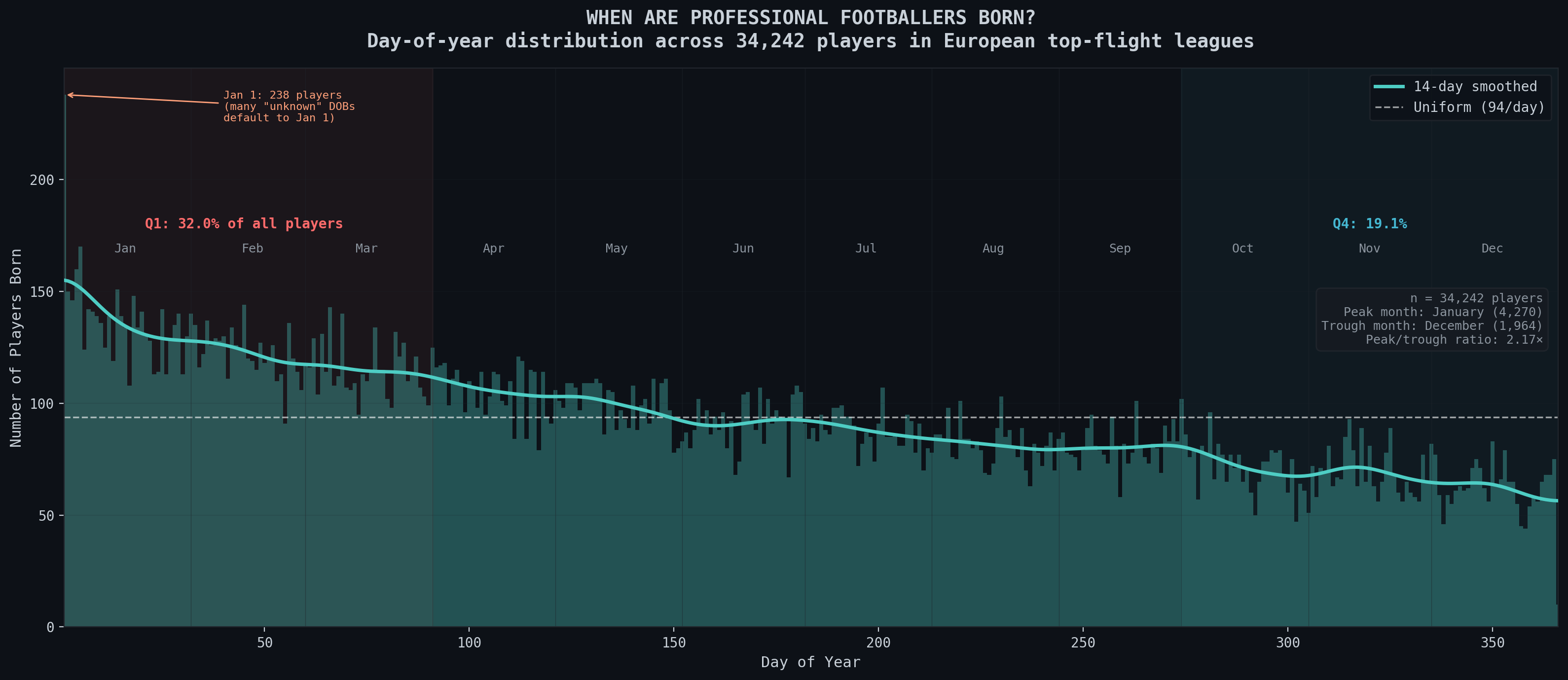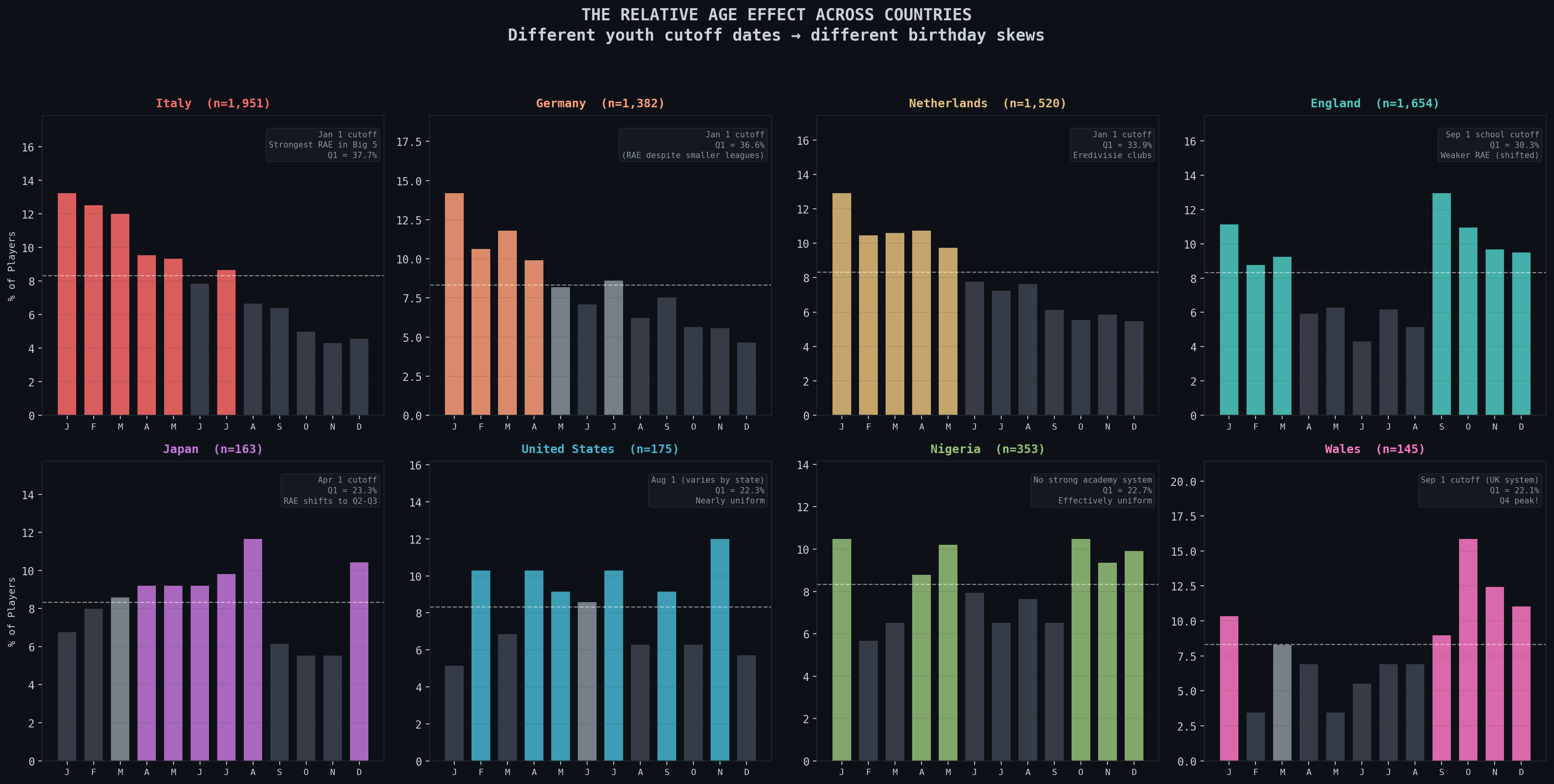 The top row is all countries who have cutoffs on Jan 1 and the bottom row is for countries where the cutoff is either a different day or not as well-defined. For example, Japan uses Apr 1 and Wales uses Sep 1, the start of their school year. Nigeria and the USA don’t have a uniformly enforced date and thus the distribution is actually somewhat uniform and not just skewed to right after their respective start dates.