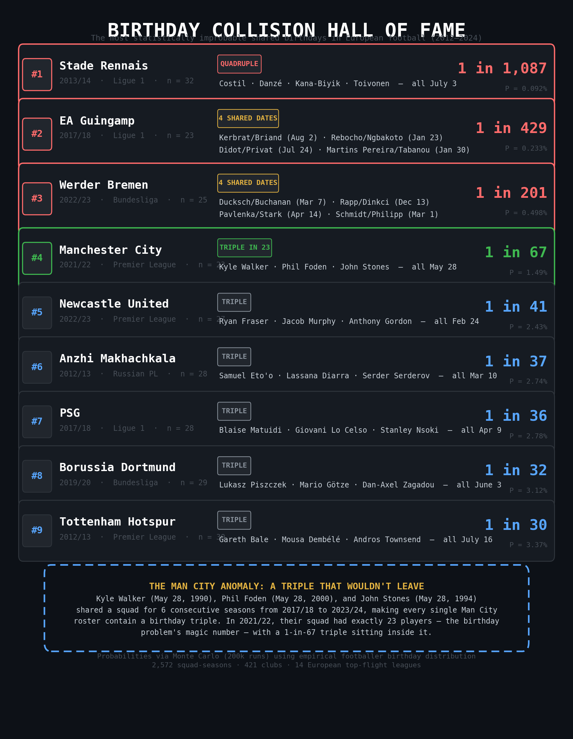 A final note as to what the most improbable events I found were, including four players with the same birthday, and four shared birthdays.