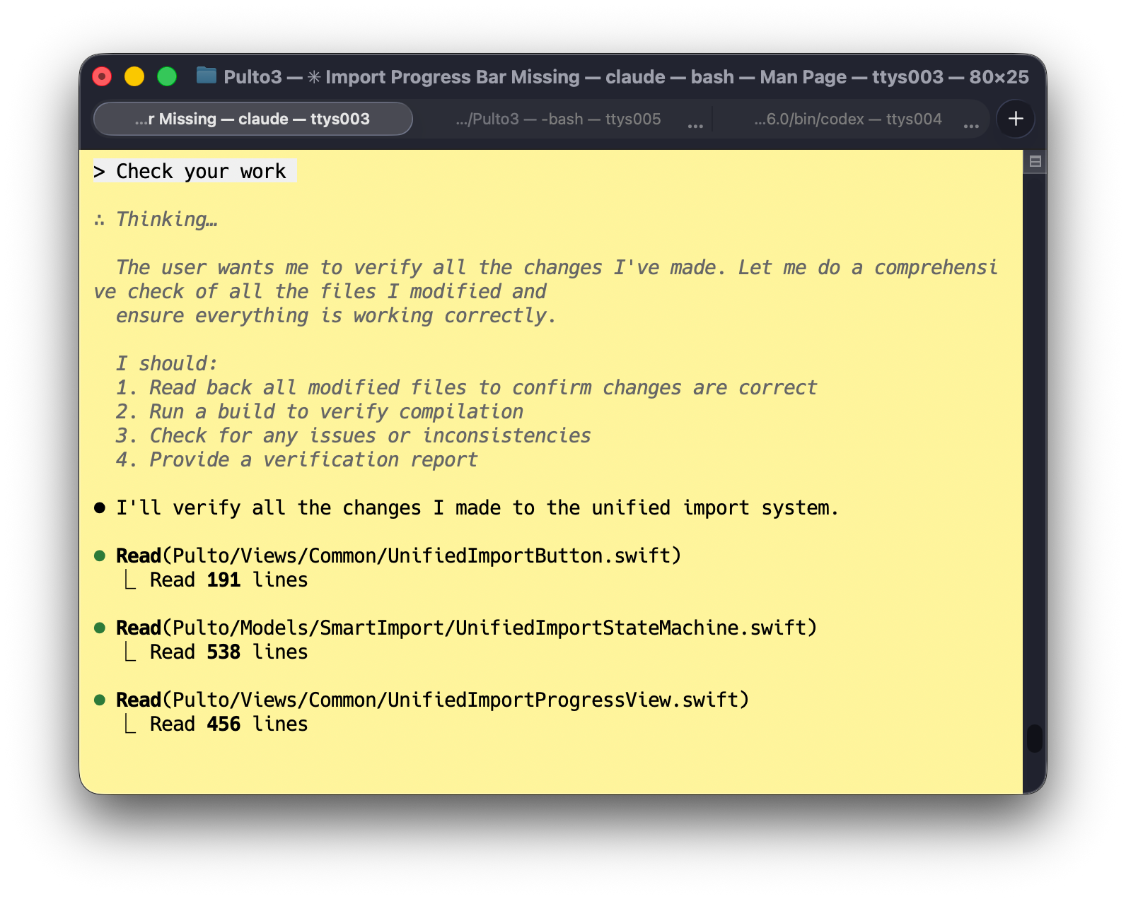 Asking coding agents to check their work allows for an easy way to add self-reflection and works correctly across models like Codex or Claude Code but, what would to be counterintuitive, really is just looking at the last output for inaccuracies. One would think that both are set up to critique themselves. Instead, the agent actually finds errors or gives feedback that it couldn’t find anything. Even adding “check your work” to the default prompts that are fed into the agents, such as using AGENTS.md and asking on the next query, this technique can find inaccuracies. I would say asking “check your work” is the easiest way to make the agent do self-reflection without explicitly adding it.