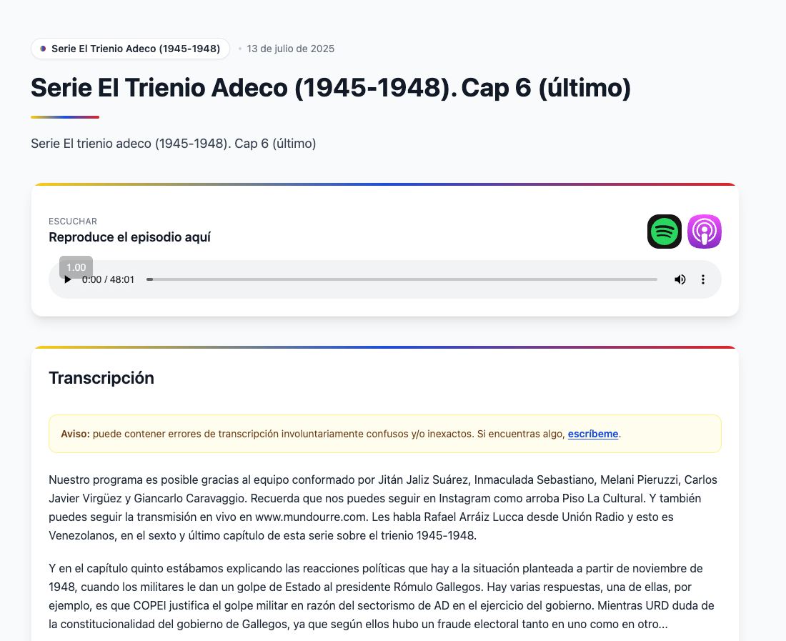 Audio is beautiful, but it’s ephemeral. You listen and it disappears. Transcripts make it searchable, quotable, and permanent. They turn a podcast into a historical archive. They make history more accessible to people who can’t listen, and to be completely honest, Rafael Arráiz Lucca’s voice is amazing, but I enjoy reading more. I can read faster, make notes, and look things up. It’s just easier for me, and I assume it’s the same for other people.