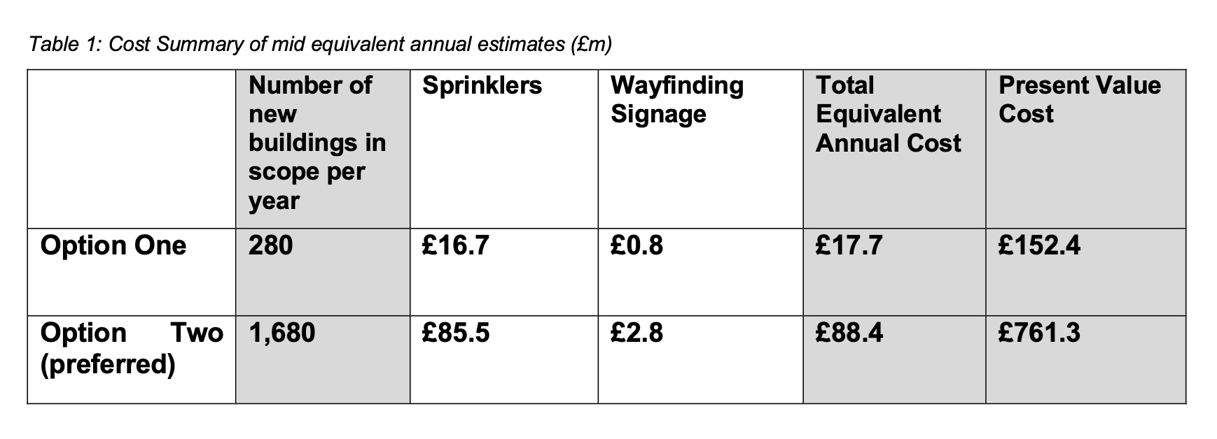 In the UK in 2017, a social housing block caught fire and killed 73 people. In response to this, people considered mandating sprinklers in high rises. Part of the government wrote a report on it. I’m going to go into this report in a bit of detail, because I find it so baffling. Listen, I’m sorry that I’m about to show you some tables from a government report, but I am a bit het up about this. I really wonder if I’m misreading. Please help me out if I am!