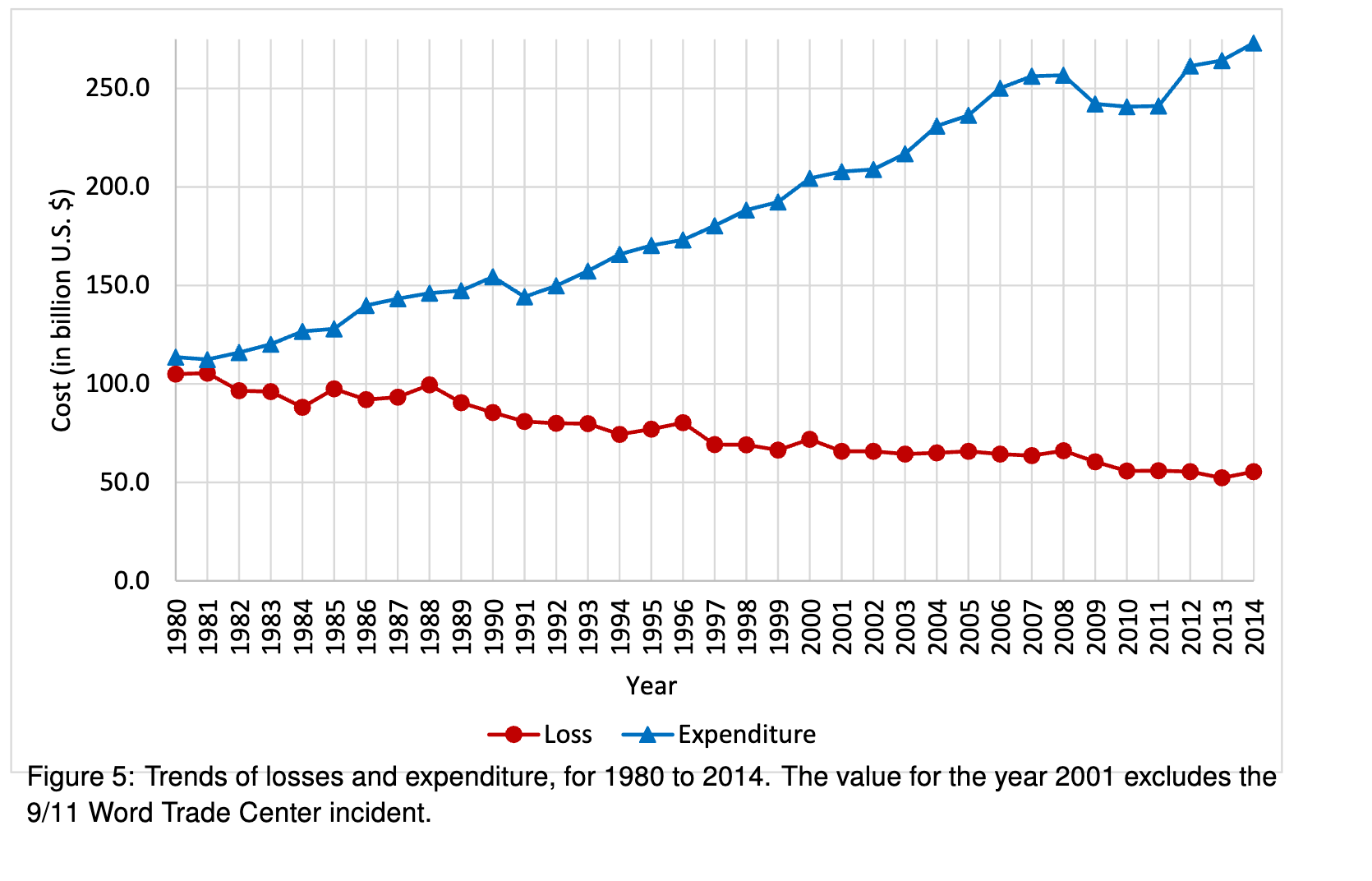 Let’s just look for a second at adjusting for population growth. Would that change things much? The report estimates the “human loss” (things like deaths and injuries) in 1980 to be $28 billion. Increasing that by 40% would give $40 billion. We could add that extra $12 billion to the averted losses. But, even with that adjustment, expenditures are still resoundingly larger than the averted losses.