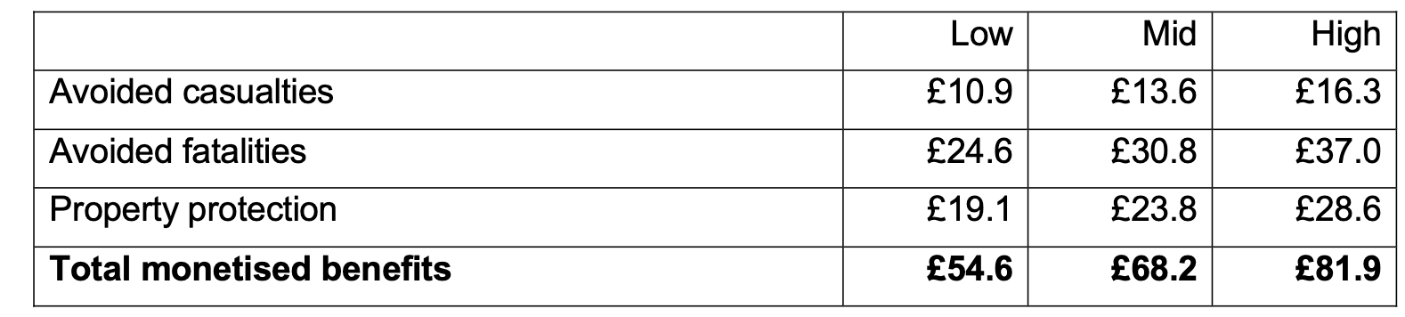 They found that Option 1 would save about £8.4M of lives and health and properties. And that Option 2 would save about £68.2M of the same. Of course, Option 0 saves nothing