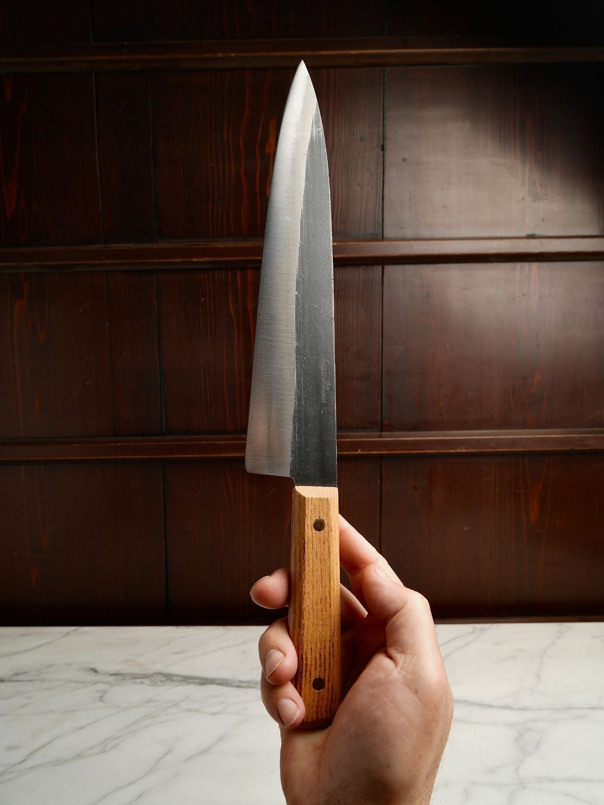 Around 2018, I began noticing people bringing re-handled Forgecraft chef knives to the shop for sharpening. I was a little dumbstruck; it struck me as more than a little weird. I think I also felt that all my efforts to introduce people to the great old culinary knives were in vain, as this trailer trash was being crowned. I vaguely remember acting the cranky old man, accusing people of ‘putting lipstick on a pig’ when finding them rehandling expensive materials in sharpening orders. Maybe I wasn’t being fair, I suspected but I also didn’t understand why go to so much trouble to re-handle and polish a Forgecraft.