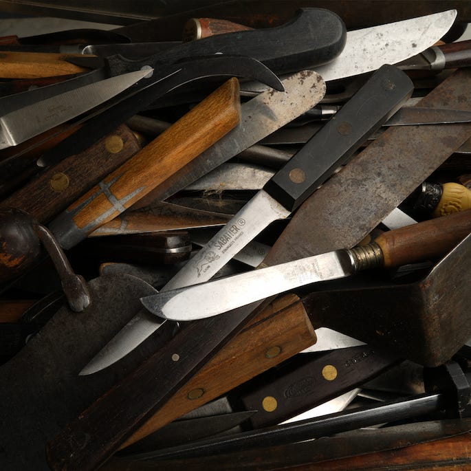 I learned what to pass up, mostly the hard way, buying a knife for $10 and selling it for $8 at auction, for instance, or that any knife with a chef’s name on it would probably get laughed at in a professional kitchen. These shame-filled events and their associated knives were etched in my memory. I would walk on by if I saw them, keep scanning for the telltale handle of a chef knife, a box that could contain pocket knives, or a box of kitchen utensils that could have a stowaway knife in it. I could scan the primmest, most tastefully turned out booth in 10 seconds and the biggest heap of meth rubble that vomited itself out the back of a dirty white van in 20 seconds. I got good at finding things quickly and keeping a straight face, asking how much something was when I found something great. There were a few other guys who were also looking for knives; sometimes they had another specialty too, maybe old fishing gear or old pens or lighters. There were generalist buyers and specialists like me, the Johnny one notes. There were the watch guys (they were all guys), the camera people, the jewelry people who formed little conspiratorial-looking huddles with little bottles of acid and scales. The book people were usually very easy-going, and the people looking for art were often the most hostile, snotty, bump you and not say ‘excuse me’ types. The worst offender looked like a nelly Ichabod Crane and wore the least convincing toupee since Xavier Cugat. For the most part, some of the most polite were the knife guys; they would never start digging around in a box you were already sorting. Getting stabbed wasn’t a threat per se, but multiple hands in a box of knives is a bad idea. We would wait and even tell others if we passed up something somebody else might be into.