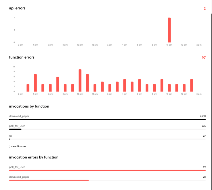 The serverless framework gives you error reporting for free. Instead of fiddling around with AWS cloudwatch or sentry, I can open up the serverless dashboard and see an overview of the health of the app. I’ve tried setting up something similar using cloudwatch and gave up because of the atrocious UX.