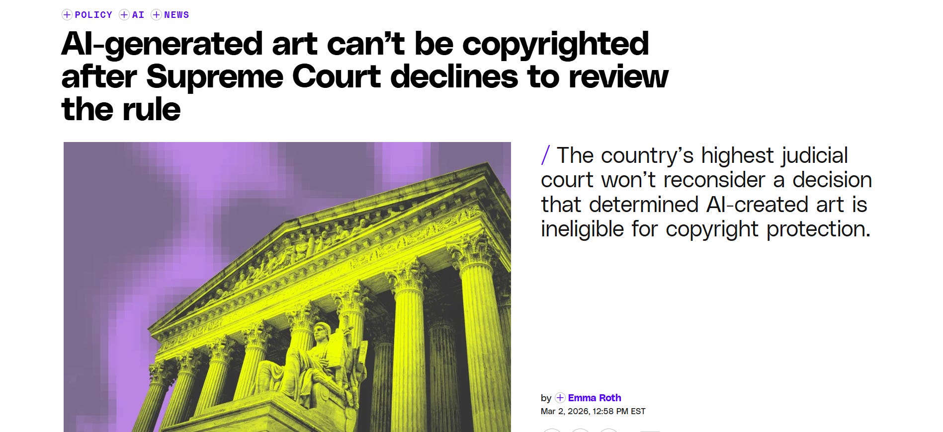 The Supreme Court’s decision not to hear Thaler v. Perlmutter has been almost universally celebrated by AI skeptics, who see it as making AI-generated artwork ineligible for copyright. Here’s The Verge’s straightforwardly-named article, “AI-generated art can’t be copyrighted after Supreme Court declines to review the rule,” from March 2, 2026: