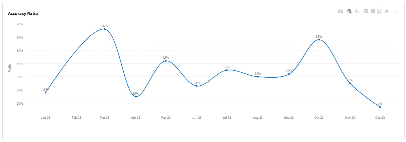 High Instability: The accuracy was never stable. It fluctuated wildly month-over-month, with no visible trend, sometimes dropping or rising dramatically. I observed 100% accuracy only 7 times out of 1204 observations.