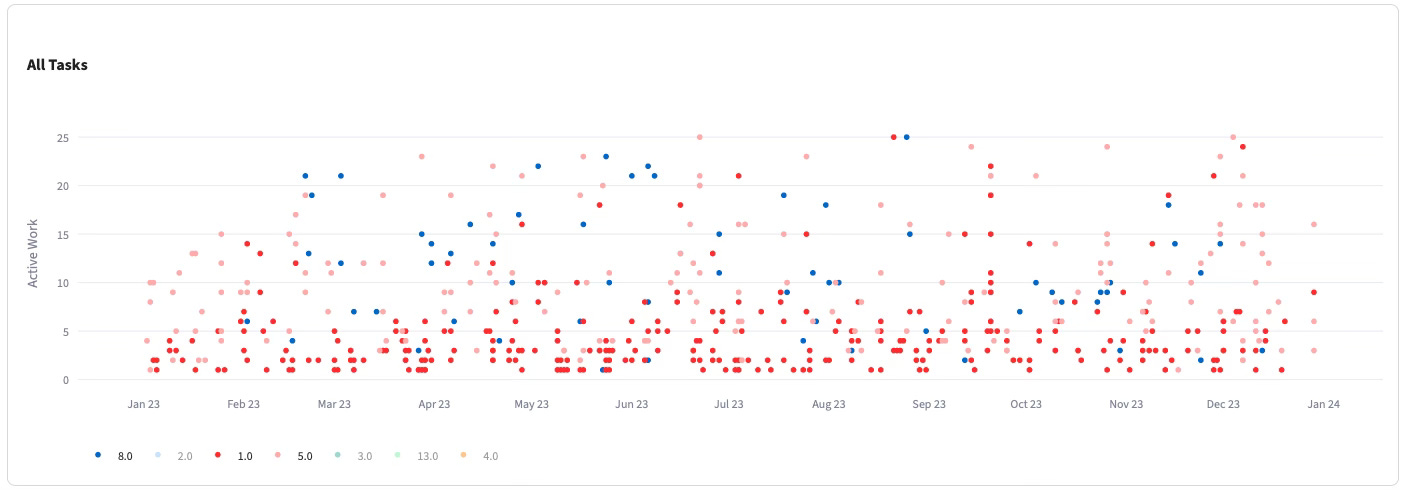 Tasks estimated as 1, 5, or 8 Story Points (as examples) could all take anywhere from 1 to dozens of working days. There were no distinct “layers” of effort that correlated with the Story Point buckets. The expectation I had 15 years ago, that SPs would neatly categorize work by size, was proven false by the data. The only observable trend was that tasks estimated as 1-3 SP had the highest chance of being genuinely small.