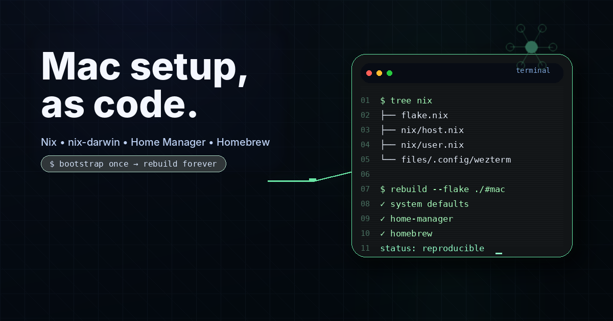 Some of your setup lives in shell config. Some is buried in macOS settings. Some is in packages you installed years ago and forgot about. Some is in app configs that only make sense after months of iteration. None of it feels hard while you are building it gradually. It only becomes painful when you have to do it again.