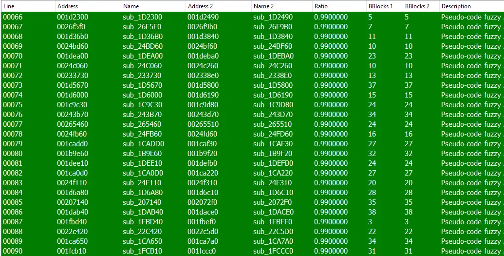 The diff output from Diaphora can be found below (don't worry, we will explain this as we go, but isn't it pretty?):
