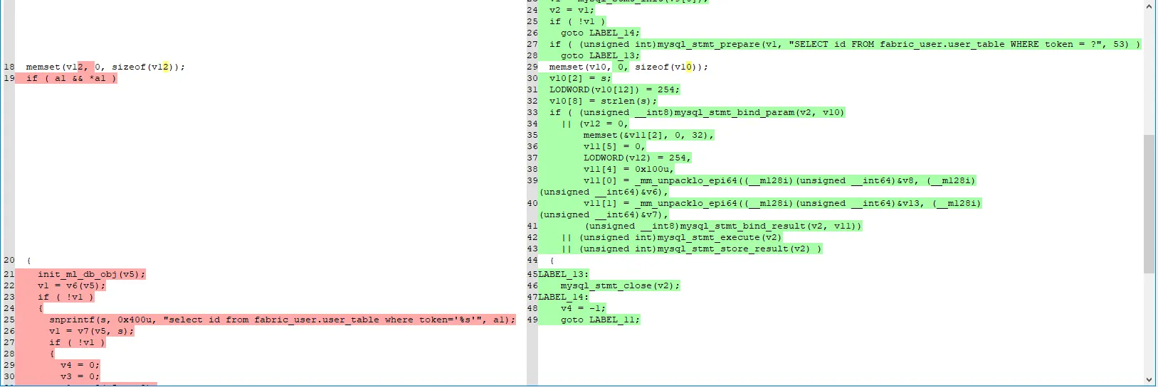 if ( (unsigned int)mysql_stmt_prepare(v1, "SELECT id FROM fabric_user.user_table WHERE token = ?", 53) )