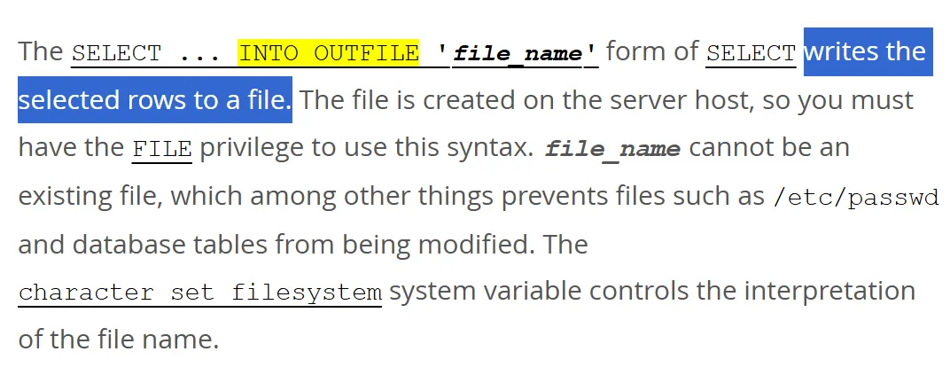 Well, dear informed reader – as we mentioned earlier, INTO OUTFILE in MySQL doesn’t allow you to overwrite or append to existing files. The file must not exist when the statement runs – otherwise, it fails. So... dead end?