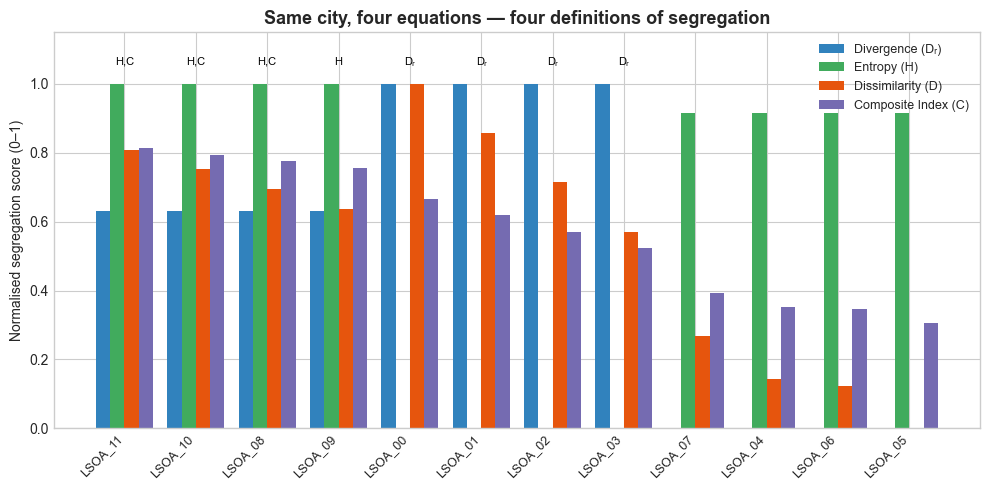 The figure below compares the indices. Each bar represents how “segregated” the same twelve neighbourhoods appear. The Dissimilarity Index mostly flags deprived, low-education areas; the Entropy Index highlights homogeneous, low diversity enclaves; the Divergence Index captures any area that looks “atypical” compared to the national average - including wealthy, monocultural ones. The Composite Index, in contrast, identifies places where ethnicity, class, and education all align - clusters of both privilege and disadvantage. The figure shows that the choice of index doesn’t just change the score; it changes the story.