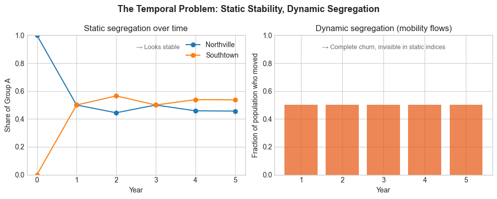 We tend to freeze segregation as a cross-section. But neighbourhoods churn: people move, age, or are priced out. Dynamic segregation, i.e., the flows rather than stocks - remains mostly invisible. Economists have the panel tools, but not the micro-spatial data; geographers have the maps, but not the identification strategies.