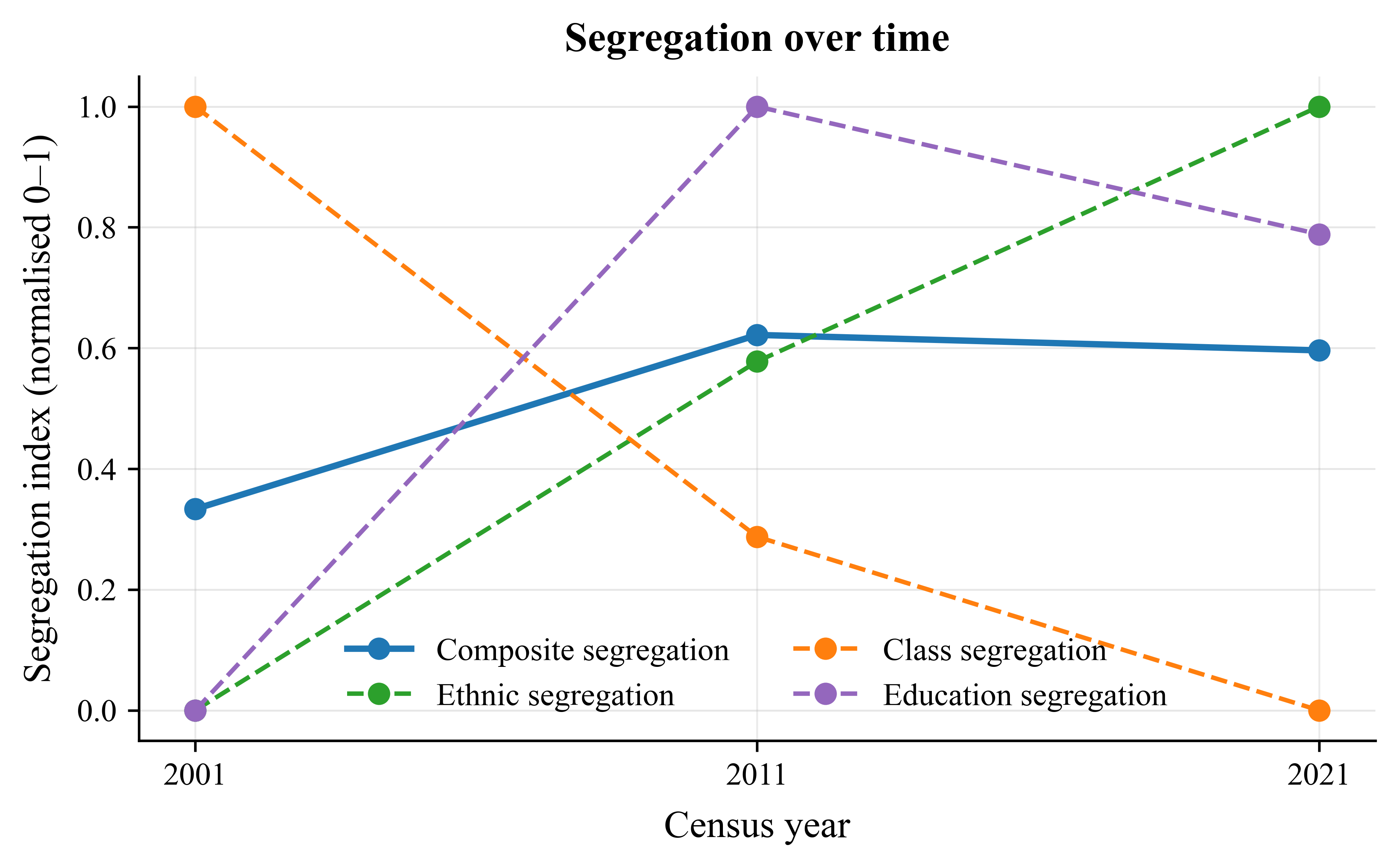Between 2001 and 2011, segregation rose sharply and has since plateaued. Class segregation fell, ethnic segregation grew, and education-based segregation stayed high. In other words, we’ve mixed more by income, but sorted more by ethnicity and credentials.